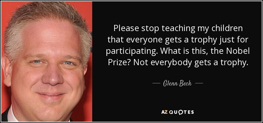 Please stop teaching my children that everyone gets a trophy just for participating. What is this, the Nobel Prize? Not everybody gets a trophy.