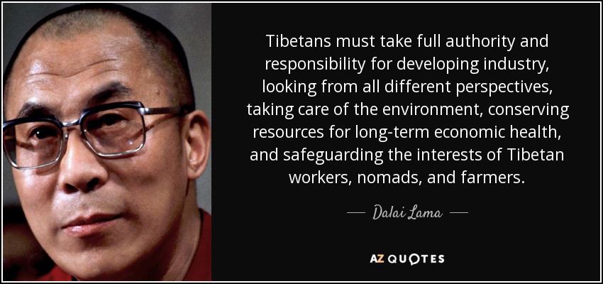 Tibetans must take full authority and responsibility for developing industry, looking from all different perspectives, taking care of the environment, conserving resources for long-term economic health, and safeguarding the interests of Tibetan workers, nomads, and farmers.