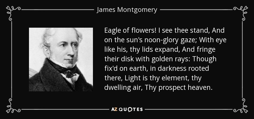 Eagle of flowers! I see thee stand, And on the sun's noon-glory gaze; With eye like his, thy lids expand, And fringe their disk with golden rays: Though fix'd on earth, in darkness rooted there, Light is thy element, thy dwelling air, Thy prospect heaven.