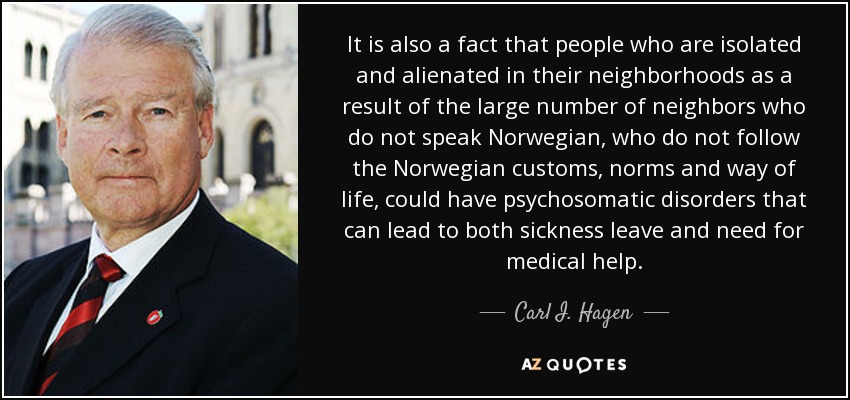 It is also a fact that people who are isolated and alienated in their neighborhoods as a result of the large number of neighbors who do not speak Norwegian, who do not follow the Norwegian customs, norms and way of life, could have psychosomatic disorders that can lead to both sickness leave and need for medical help.