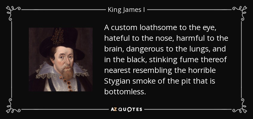 A custom loathsome to the eye, hateful to the nose, harmful to the brain, dangerous to the lungs, and in the black, stinking fume thereof nearest resembling the horrible Stygian smoke of the pit that is bottomless.