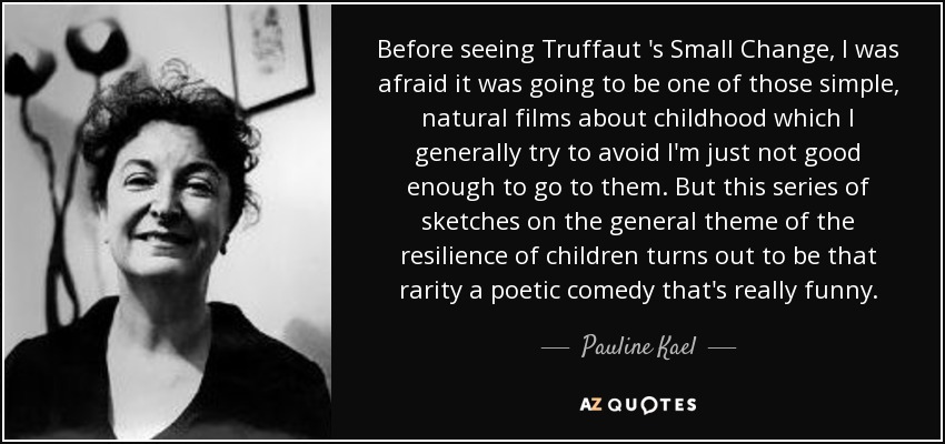 Before seeing Truffaut 's Small Change, I was afraid it was going to be one of those simple, natural films about childhood which I generally try to avoid I'm just not good enough to go to them. But this series of sketches on the general theme of the resilience of children turns out to be that rarity a poetic comedy that's really funny.