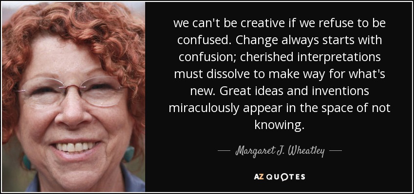 we can't be creative if we refuse to be confused. Change always starts with confusion; cherished interpretations must dissolve to make way for what's new. Great ideas and inventions miraculously appear in the space of not knowing.