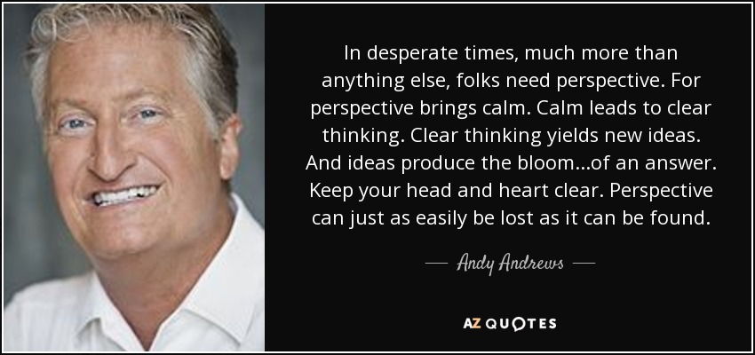 In desperate times, much more than anything else, folks need perspective. For perspective brings calm. Calm leads to clear thinking. Clear thinking yields new ideas. And ideas produce the bloom...of an answer. Keep your head and heart clear. Perspective can just as easily be lost as it can be found.