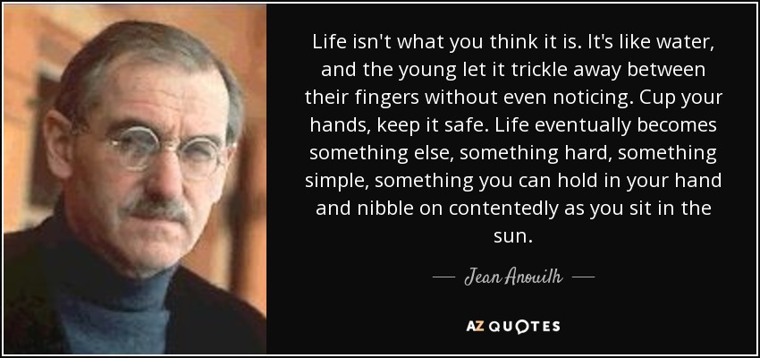 Life isn't what you think it is. It's like water, and the young let it trickle away between their fingers without even noticing. Cup your hands, keep it safe. Life eventually becomes something else, something hard, something simple, something you can hold in your hand and nibble on contentedly as you sit in the sun.