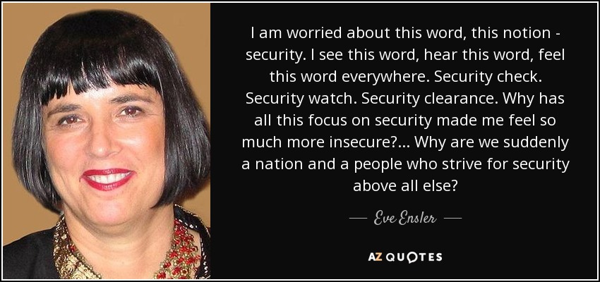 I am worried about this word, this notion - security. I see this word, hear this word, feel this word everywhere. Security check. Security watch. Security clearance. Why has all this focus on security made me feel so much more insecure? ... Why are we suddenly a nation and a people who strive for security above all else?