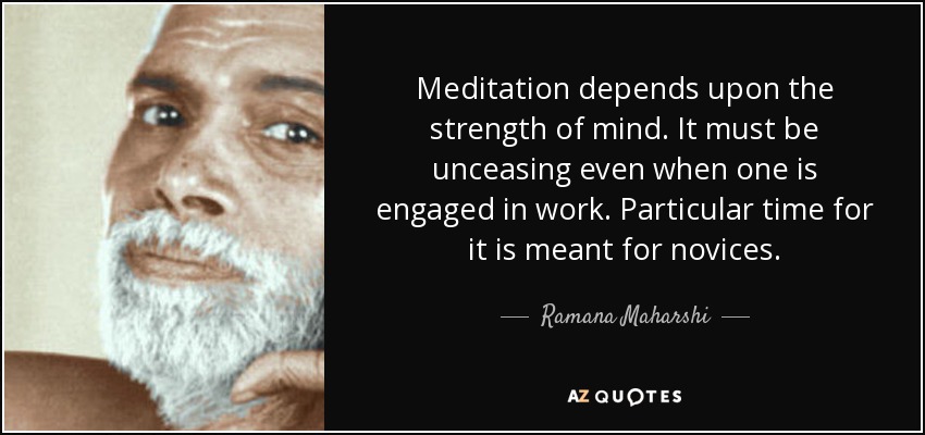 Meditation depends upon the strength of mind. It must be unceasing even when one is engaged in work. Particular time for it is meant for novices.