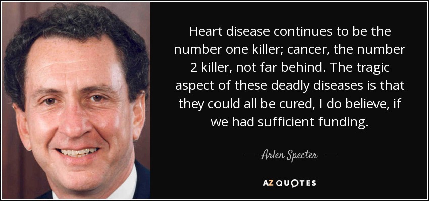 Heart disease continues to be the number one killer; cancer, the number 2 killer, not far behind. The tragic aspect of these deadly diseases is that they could all be cured, I do believe, if we had sufficient funding.
