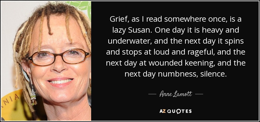 Grief, as I read somewhere once, is a lazy Susan. One day it is heavy and underwater, and the next day it spins and stops at loud and rageful, and the next day at wounded keening, and the next day numbness, silence.