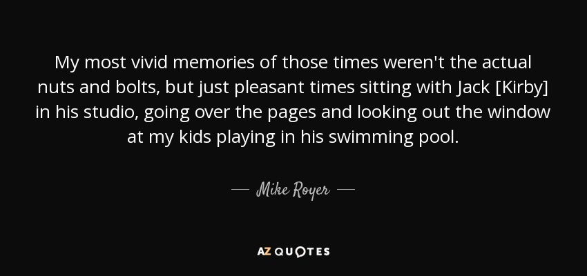 My most vivid memories of those times weren't the actual nuts and bolts, but just pleasant times sitting with Jack [Kirby] in his studio, going over the pages and looking out the window at my kids playing in his swimming pool .