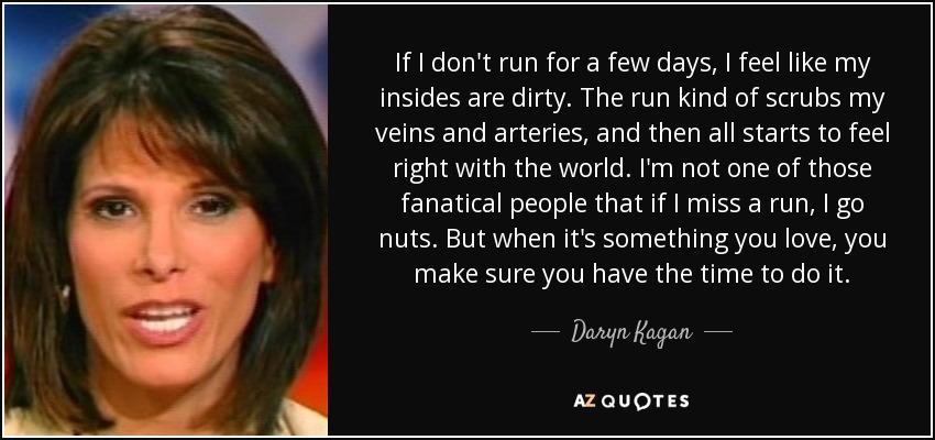 If I don't run for a few days, I feel like my insides are dirty. The run kind of scrubs my veins and arteries, and then all starts to feel right with the world. I'm not one of those fanatical people that if I miss a run, I go nuts. But when it's something you love, you make sure you have the time to do it.