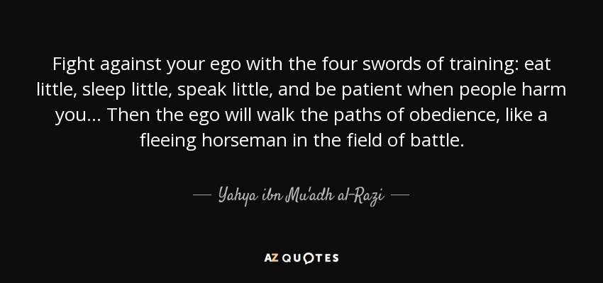 Fight against your ego with the four swords of training: eat little, sleep little, speak little, and be patient when people harm you... Then the ego will walk the paths of obedience, like a fleeing horseman in the field of battle.