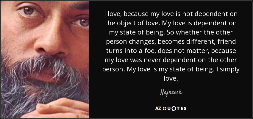 I love, because my love is not dependent on the object of love. My love is dependent on my state of being. So whether the other person changes, becomes different, friend turns into a foe, does not matter, because my love was never dependent on the other person. My love is my state of being. I simply love.