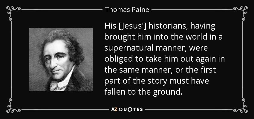 His [Jesus'] historians, having brought him into the world in a supernatural manner, were obliged to take him out again in the same manner, or the first part of the story must have fallen to the ground.