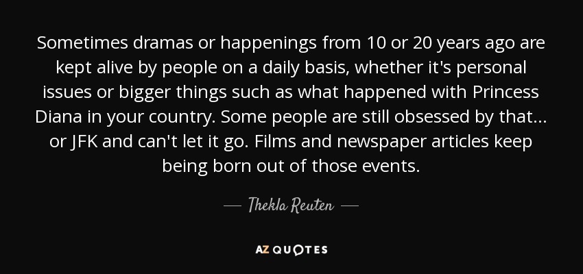 Sometimes dramas or happenings from 10 or 20 years ago are kept alive by people on a daily basis, whether it's personal issues or bigger things such as what happened with Princess Diana in your country. Some people are still obsessed by that... or JFK and can't let it go. Films and newspaper articles keep being born out of those events.