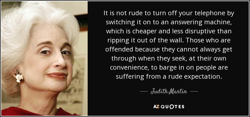 It is not rude to turn off your telephone by switching it on to an answering machine, which is cheaper and less disruptive than ripping it out of the wall. Those who are offended because they cannot always get through when they seek, at their own convenience, to barge in on people are suffering from a rude expectation.