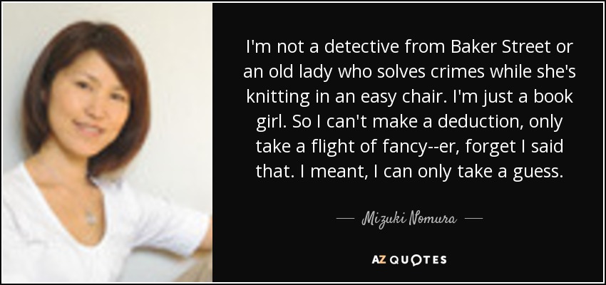 I'm not a detective from Baker Street or an old lady who solves crimes while she's knitting in an easy chair. I'm just a book girl. So I can't make a deduction, only take a flight of fancy--er, forget I said that. I meant, I can only take a guess.