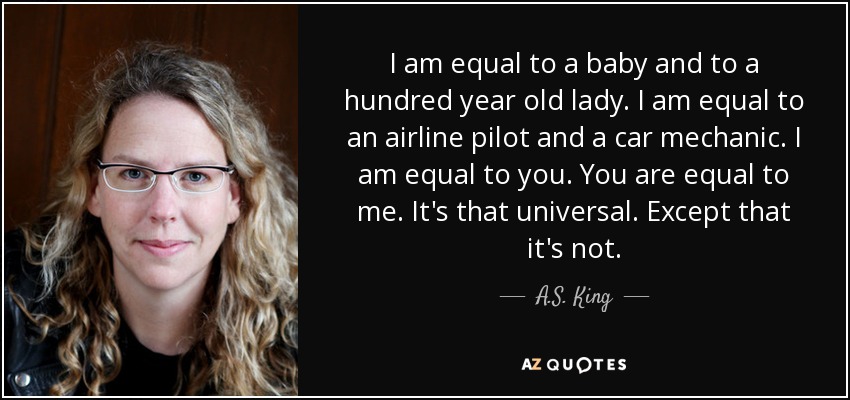 I am equal to a baby and to a hundred year old lady. I am equal to an airline pilot and a car mechanic. I am equal to you. You are equal to me. It's that universal. Except that it's not.