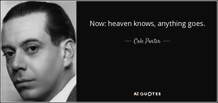 In olden days a glimpse of stocking was looked on as something shocking. Now, Heaven knows, anything goes. The world has gone mad today, and good's bad today, and black's white today, and day's night today.
