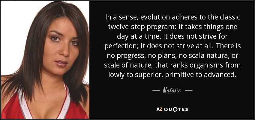 In a sense, evolution adheres to the classic twelve-step program: it takes things one day at a time. It does not strive for perfection; it does not strive at all. There is no progress, no plans, no scala natura, or scale of nature, that ranks organisms from lowly to superior, primitive to advanced.