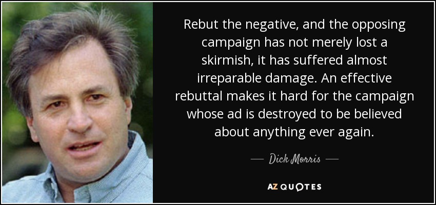 Rebut the negative, and the opposing campaign has not merely lost a skirmish, it has suffered almost irreparable damage. An effective rebuttal makes it hard for the campaign whose ad is destroyed to be believed about anything ever again.