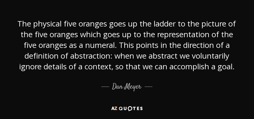 The physical five oranges goes up the ladder to the picture of the five oranges which goes up to the representation of the five oranges as a numeral. This points in the direction of a definition of abstraction: when we abstract we voluntarily ignore details of a context, so that we can accomplish a goal.
