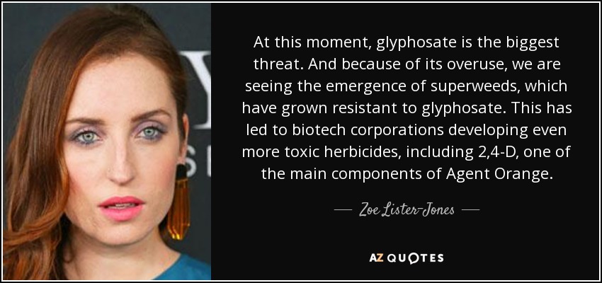 At this moment, glyphosate is the biggest threat. And because of its overuse, we are seeing the emergence of superweeds, which have grown resistant to glyphosate. This has led to biotech corporations developing even more toxic herbicides, including 2,4-D, one of the main components of Agent Orange.