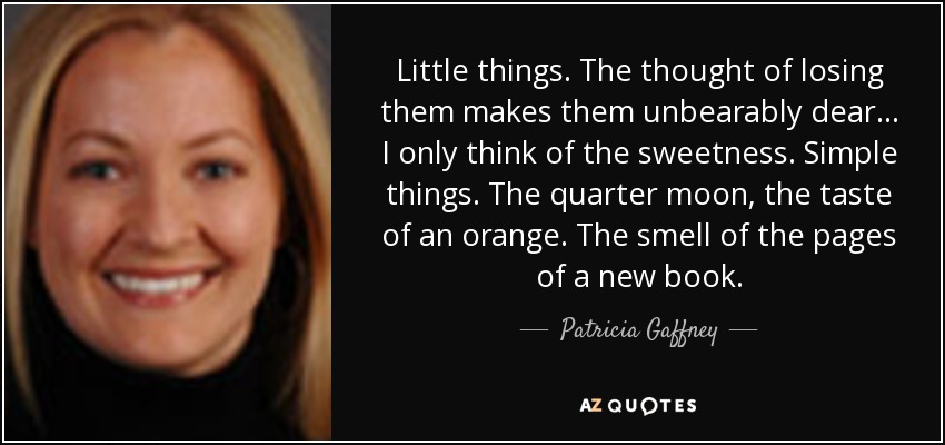 Little things. The thought of losing them makes them unbearably dear ... I only think of the sweetness. Simple things. The quarter moon, the taste of an orange. The smell of the pages of a new book.