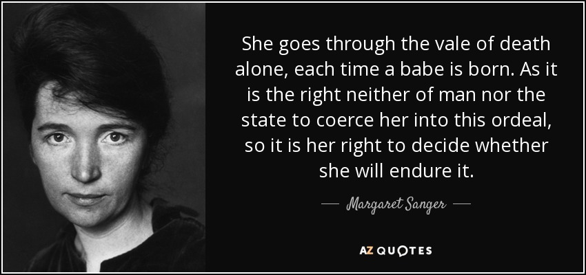 She goes through the vale of death alone, each time a babe is born. As it is the right neither of man nor the state to coerce her into this ordeal, so it is her right to decide whether she will endure it.