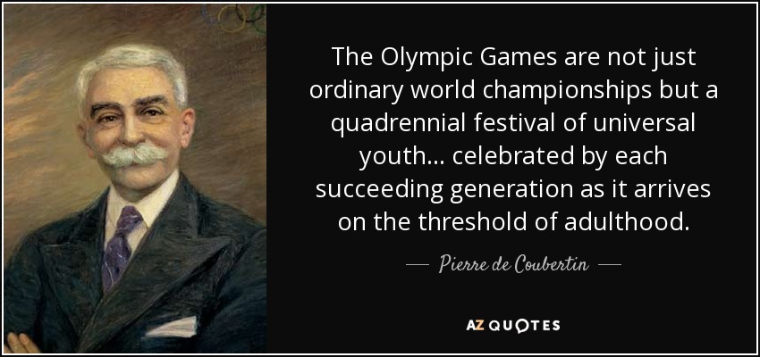The Olympic Games are not just ordinary world championships but a quadrennial festival of universal youth. . . celebrated by each succeeding generation as it arrives on the threshold of adulthood.
