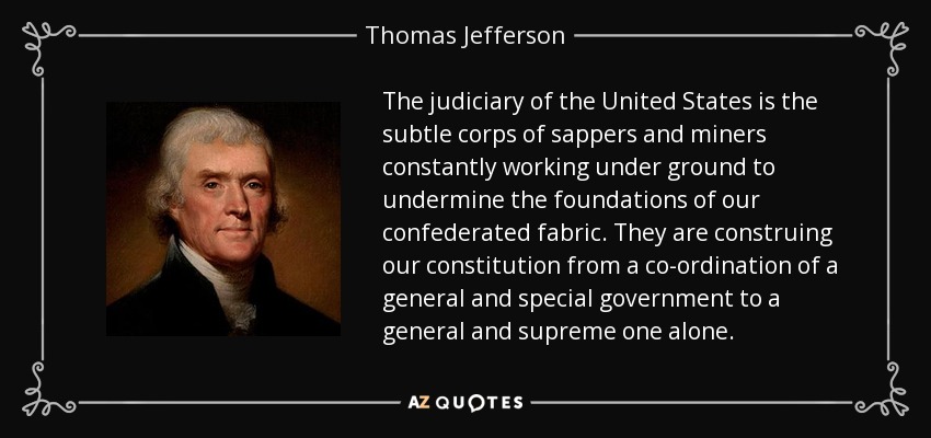 The judiciary of the United States is the subtle corps of sappers and miners constantly working under ground to undermine the foundations of our confederated fabric. They are construing our constitution from a co-ordination of a general and special government to a general and supreme one alone.