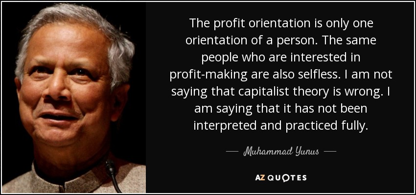 The profit orientation is only one orientation of a person. The same people who are interested in profit-making are also selfless. I am not saying that capitalist theory is wrong. I am saying that it has not been interpreted and practiced fully.
