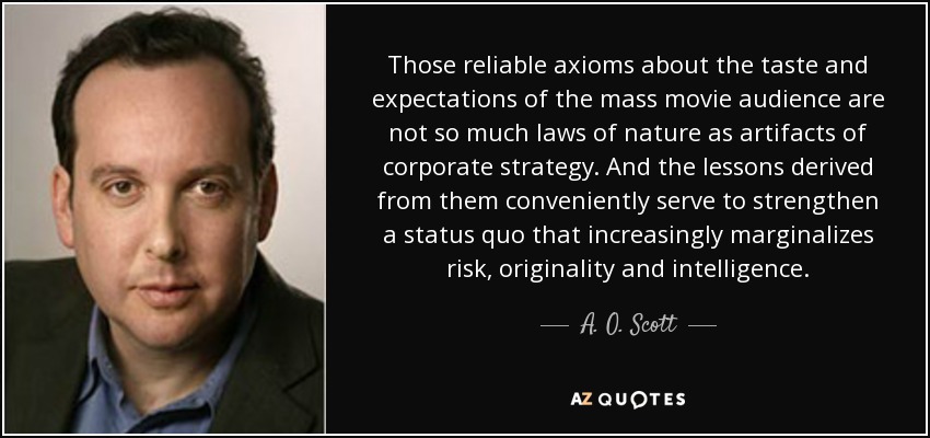Those reliable axioms about the taste and expectations of the mass movie audience are not so much laws of nature as artifacts of corporate strategy. And the lessons derived from them conveniently serve to strengthen a status quo that increasingly marginalizes risk, originality and intelligence.
