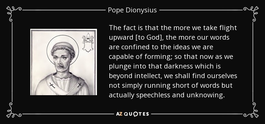 The fact is that the more we take flight upward [to God], the more our words are confined to the ideas we are capable of forming; so that now as we plunge into that darkness which is beyond intellect, we shall find ourselves not simply running short of words but actually speechless and unknowing.