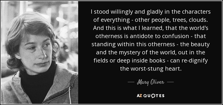 I stood willingly and gladly in the characters of everything - other people, trees, clouds. And this is what I learned, that the world's otherness is antidote to confusion - that standing within this otherness - the beauty and the mystery of the world, out in the fields or deep inside books - can re-dignify the worst-stung heart.