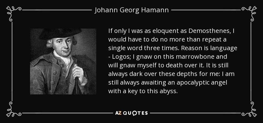 If only I was as eloquent as Demosthenes, I would have to do no more than repeat a single word three times. Reason is language - Logos; I gnaw on this marrowbone and will gnaw myself to death over it. It is still always dark over these depths for me: I am still always awaiting an apocalyptic angel with a key to this abyss.