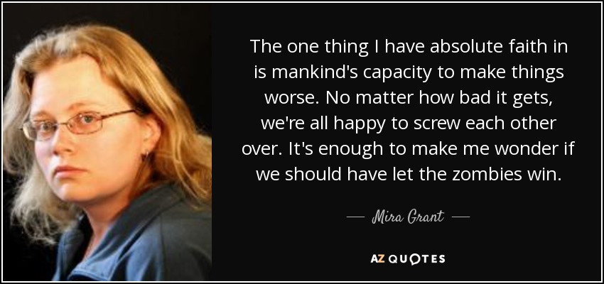 The one thing I have absolute faith in is mankind's capacity to make things worse. No matter how bad it gets, we're all happy to screw each other over. It's enough to make me wonder if we should have let the zombies win.
