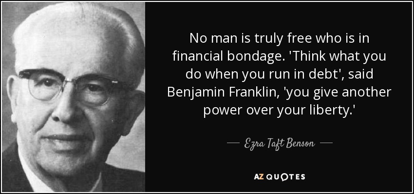 No man is truly free who is in financial bondage. 'Think what you do when you run in debt', said Benjamin Franklin, 'you give another power over your liberty.'