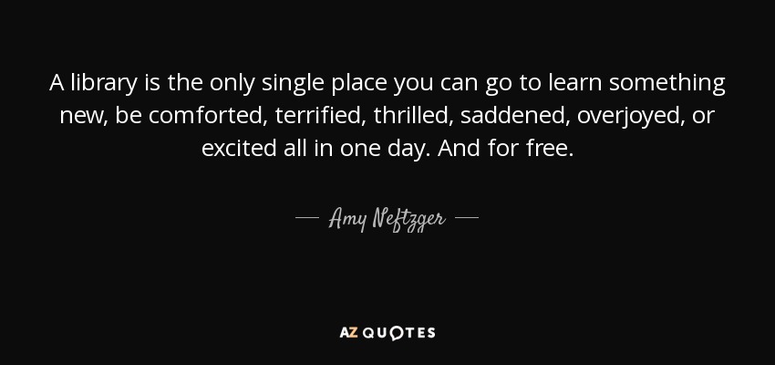 A library is the only single place you can go to learn something new, be comforted, terrified, thrilled, saddened, overjoyed, or excited all in one day. And for free.