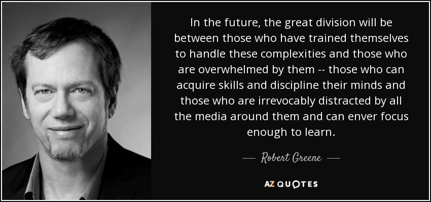 In the future, the great division will be between those who have trained themselves to handle these complexities and those who are overwhelmed by them -- those who can acquire skills and discipline their minds and those who are irrevocably distracted by all the media around them and can enver focus enough to learn.