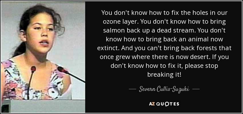You don't know how to fix the holes in our ozone layer. You don't know how to bring salmon back up a dead stream. You don't know how to bring back an animal now extinct. And you can't bring back forests that once grew where there is now desert. If you don't know how to fix it, please stop breaking it!