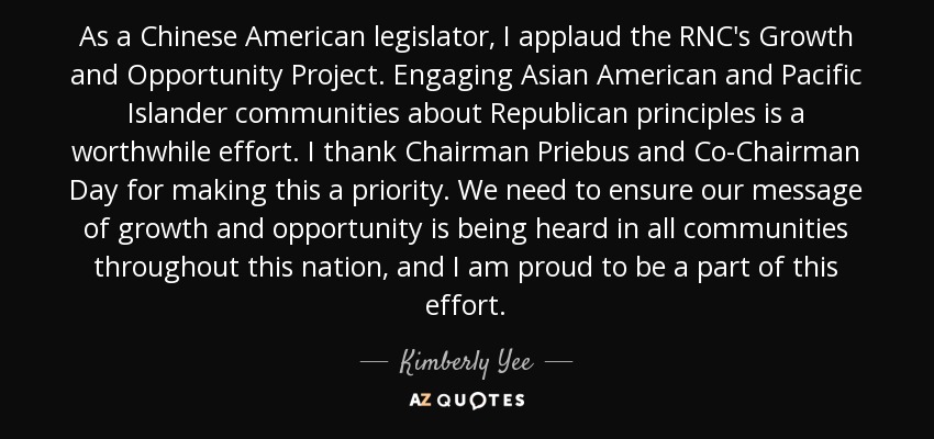 As a Chinese American legislator, I applaud the RNC's Growth and Opportunity Project. Engaging Asian American and Pacific Islander communities about Republican principles is a worthwhile effort. I thank Chairman Priebus and Co-Chairman Day for making this a priority. We need to ensure our message of growth and opportunity is being heard in all communities throughout this nation, and I am proud to be a part of this effort.