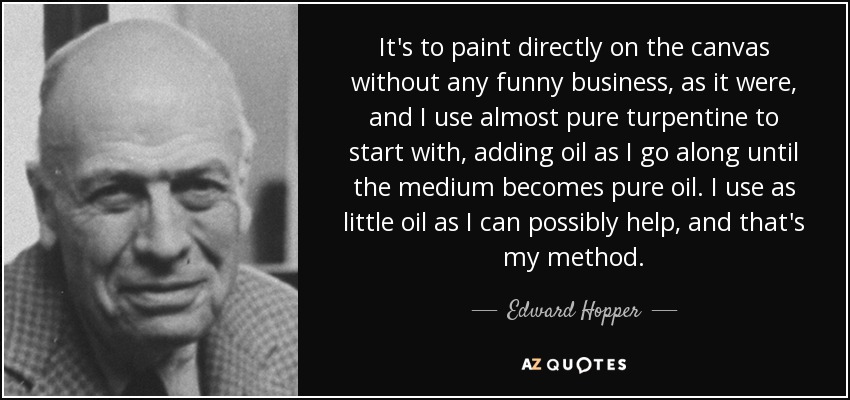 It's to paint directly on the canvas without any funny business, as it were, and I use almost pure turpentine to start with, adding oil as I go along until the medium becomes pure oil. I use as little oil as I can possibly help, and that's my method.