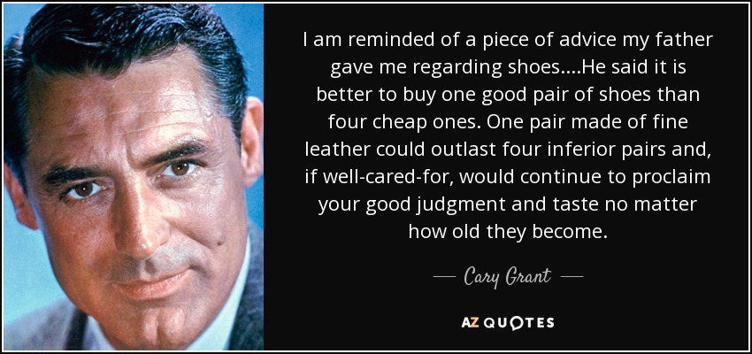 I am reminded of a piece of advice my father gave me regarding shoes. ...He said it is better to buy one good pair of shoes than four cheap ones. One pair made of fine leather could outlast four inferior pairs and, if well-cared-for, would continue to proclaim your good judgment and taste no matter how old they become.
