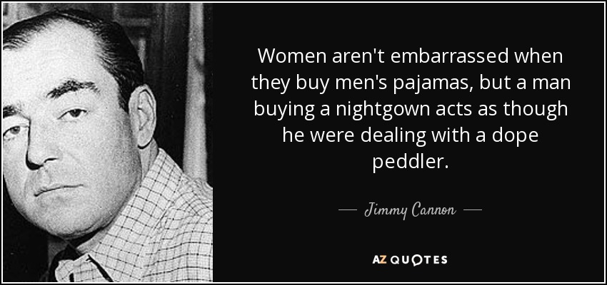 Women aren't embarrassed when they buy men's pajamas, but a man buying a nightgown acts as though he were dealing with a dope peddler.
