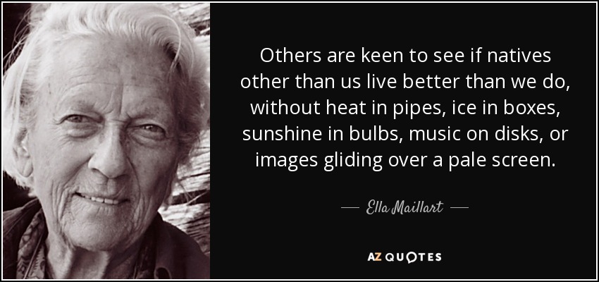 Others are keen to see if natives other than us live better than we do, without heat in pipes, ice in boxes, sunshine in bulbs, music on disks, or images gliding over a pale screen.
