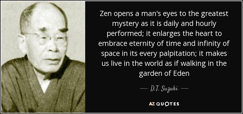 Zen opens a man's eyes to the greatest mystery as it is daily and hourly performed; it enlarges the heart to embrace eternity of time and infinity of space in its every palpitation; it makes us live in the world as if walking in the garden of Eden