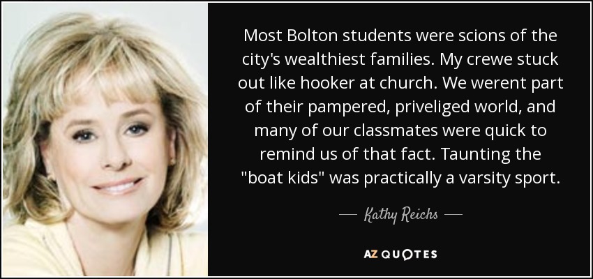 Most Bolton students were scions of the city's wealthiest families. My crewe stuck out like hooker at church. We werent part of their pampered, priveliged world, and many of our classmates were quick to remind us of that fact. Taunting the "boat kids" was practically a varsity sport.