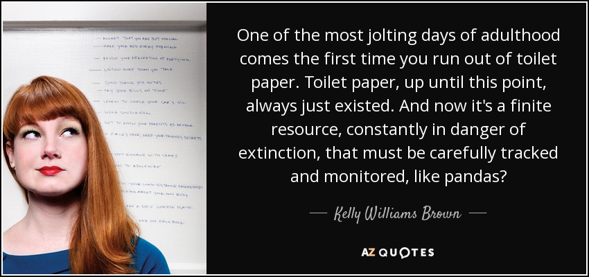 One of the most jolting days of adulthood comes the first time you run out of toilet paper. Toilet paper, up until this point, always just existed. And now it's a finite resource, constantly in danger of extinction, that must be carefully tracked and monitored, like pandas?