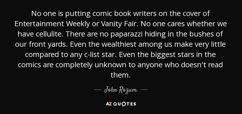 No one is putting comic book writers on the cover of Entertainment Weekly or Vanity Fair. No one cares whether we have cellulite. There are no paparazzi hiding in the bushes of our front yards. Even the wealthiest among us make very little compared to any c-list star. Even the biggest stars in the comics are completely unknown to anyone who doesn't read them.